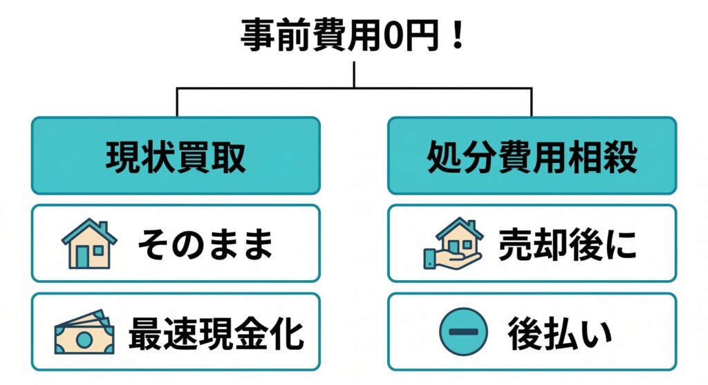 - 事前の現金準備(手出し)は0円。処分費用は売却代金からの後払い(相殺)でOK